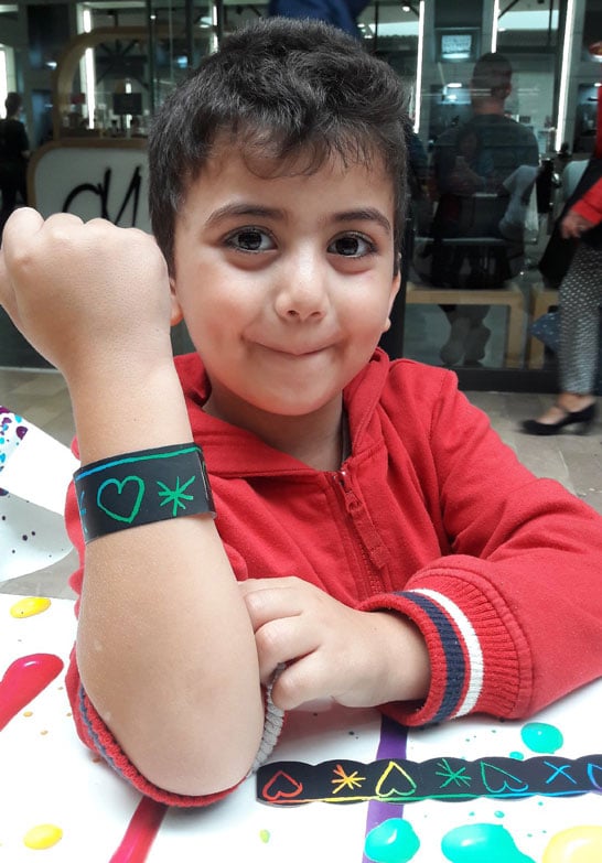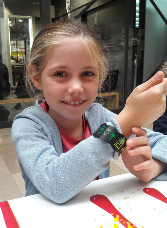 Chaque enfant reçoit un bracelet préformé, à la surface noire. Grâce à un grattoir en bois double fonction, il laisse libre cours à son imagination en grattant la surface pour faire apparaître les teintes multicolores cachées. En quelques minutes, son bracelet devient une œuvre d’art unique à porter fièrement !