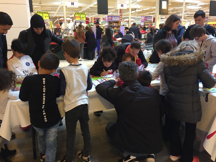 Prévue pour 100 enfants sur une prestation de 3 heures, chaque réalisation prend entre 20 et 30 minutes selon le rythme et l’inspiration des participants. L’atelier est encadré dans un espace de 4×4 mètres équipé de deux tables, de bancs ou de chaises.