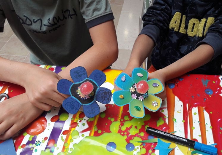 Guidés par un animateur, les enfants utilisent des feuilles cartonnées multicolores (rouge, jaune, bleue, verte, orange, etc.) pour créer les pétales de leur fleur autour d’une délicieuse sucette. À l’aide de ciseaux adaptés, ils découpent, assemblent, décorent, et repartent fièrement avec leur création sucrée et fleurie.