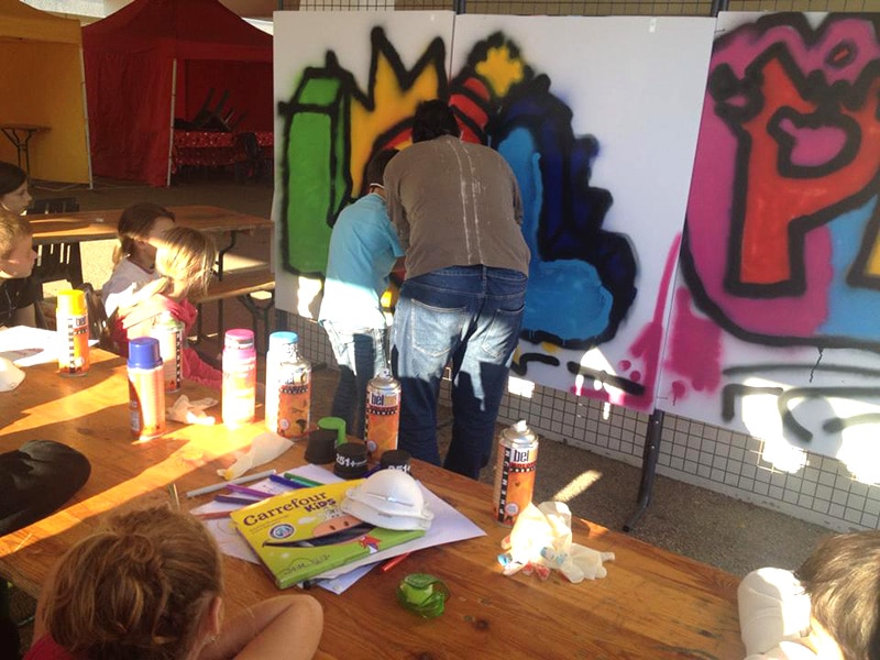 Encadrés par des animateurs, les enfants (et les plus grands !) s’initient aux bases du graffiti sur un support sécurisé, dans une ambiance détendue et colorée. L’objectif ? Laisser parler son imagination, s’exprimer librement et co-construire une œuvre unique qui restera comme souvenir de l’événement.